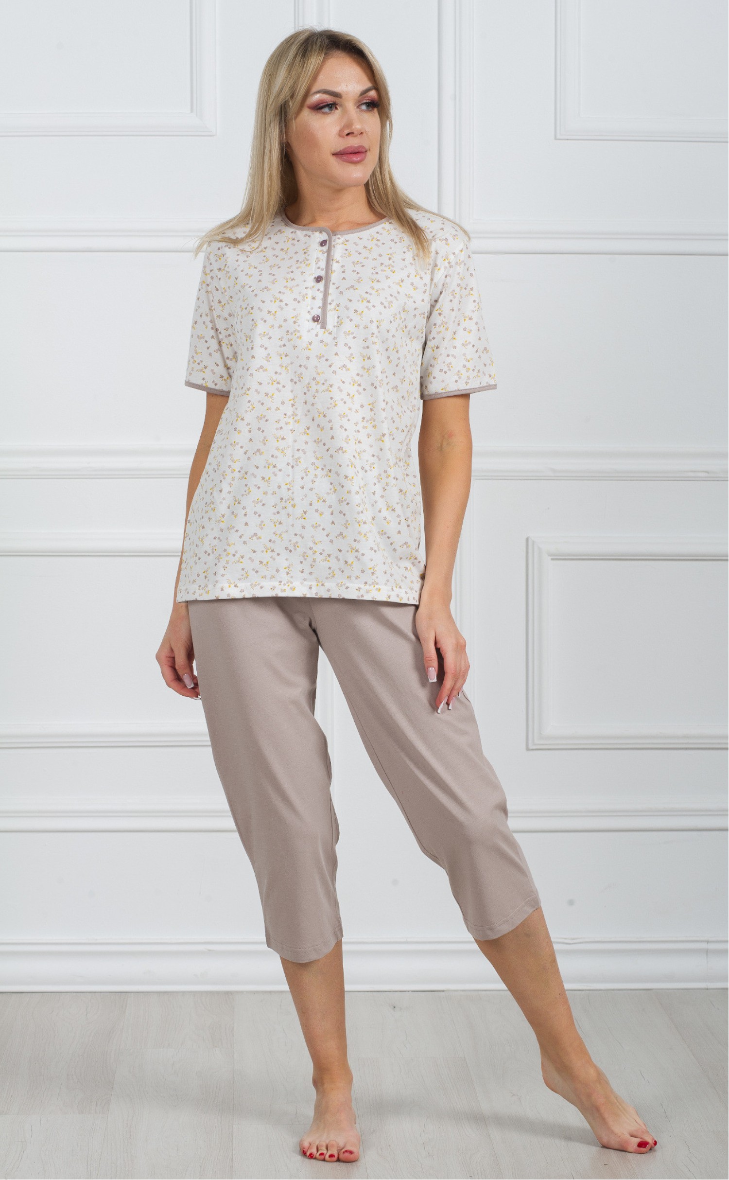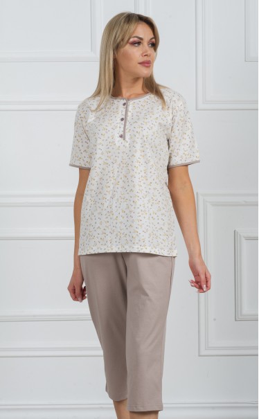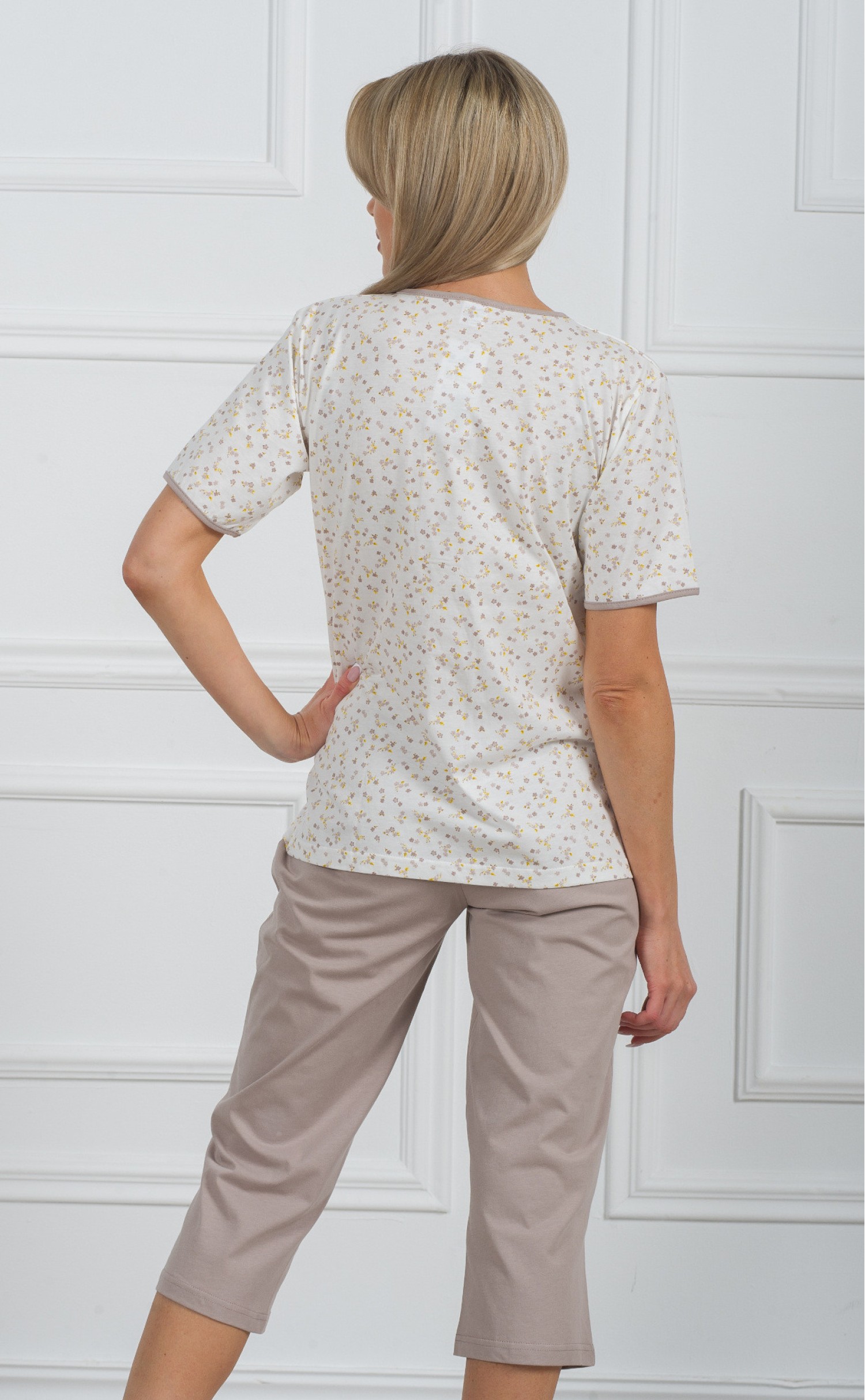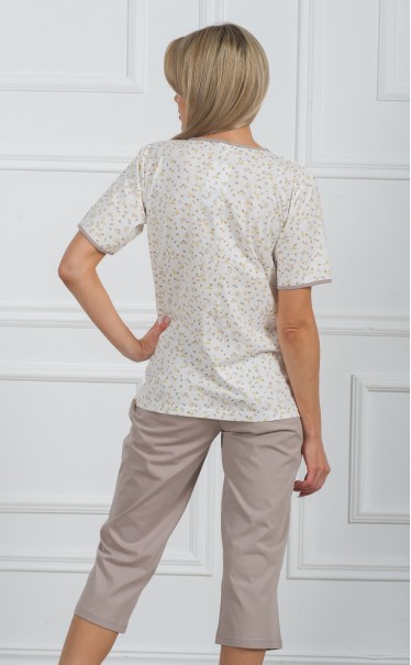 Комплект футболка с бриджами "Мелкие серо-желтые цветочки на белом"